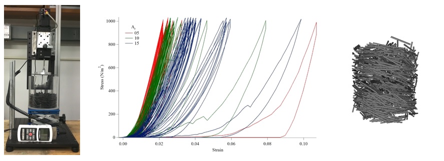 Considerable hysteresis is observed over the first few cycles, but the response starts to approach a more reversible path with each cycle. We observe that rods of small aspect ratio tend to have small compression under the same stress as compared to rods of higher aspect ratio because they pack more densely, and thus have larger Young’s modulus. The stress increased non-linearly for all values of strain. The stress-strain response of rod packing showed 2 distinct regimes and were explained by accounting for bending and local compression of rods.